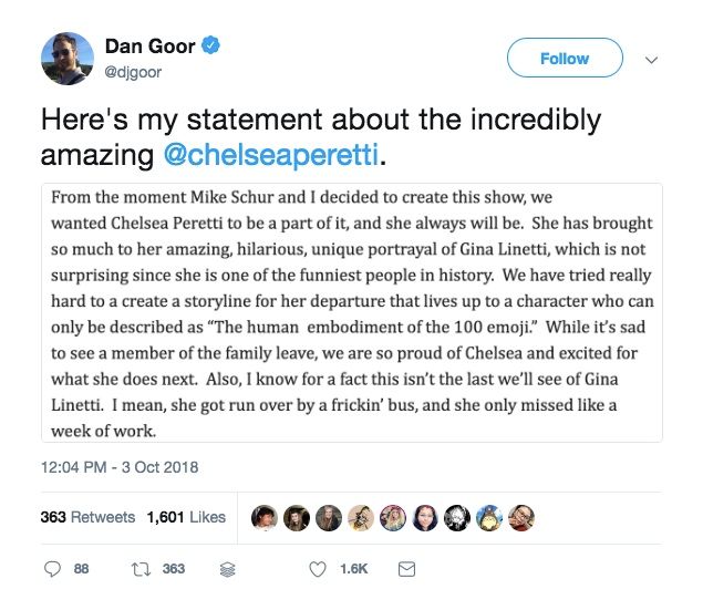 In response to Peretti's announcement, Goor wrote his own statement on Twitter. He praised her "amazing, hilarious, unique portrayal" of the character, calling the actress "one of the funniest people in history." He also teased how difficult it was to write an appropriate storyline to send off the character.